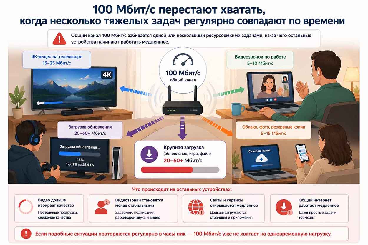 О том, что 100 Мбит/с уже недостаточно, говорит не разовый сбой, а повторяющаяся картина в часы максимальной нагрузки. Если вечером интернет нужен нескольким людям одновременно, и в этот момент одна загрузка начинает заметно замедлять работу остальных устройств, запаса скорости уже не хватает.